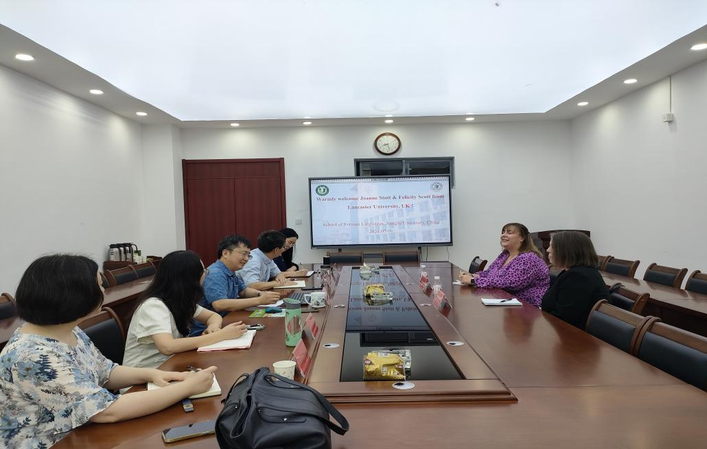 School of Foreign Languages held discussions on collaborative education initiatives with Joanne Stott, Director of International Recruitment , and Felicity Scott, International Collaboration Officer from the Faculty of Humanities and Social Sciences of Lancaster University on July 1st. Lancaster University is ranked 122nd in the QS World University Rankings. The discussion was hosted by Li Chongyue, Dean of School of Foreign Languages. Other participants included Li Jiajun, Deputy Dean in charge of undergraduate teaching affairs; Li Xia, Deputy Dean assisting in graduate education; Feng Ruizhen, Director of the MTI Education Center; and Jiang Ping, a teacher who previously visited and liaised with Lancaster University. Dean Li began by providing a detailed introduction to the faculty strength, undergraduate majors, graduate programs, teaching, and research activities of School of Foreign Languages. He emphasized that the 2+1 dual-degree Master of Translation and Interpreting program is the first collaborative project signed between Jiangsu University and Lancaster University, and School of Foreign Languages is committed to effectively promoting the implementation of this program. Joanne Stott, Director of International Recruitment at Lancaster University, introduced Lancaster University's history, academic programs, and collaboration opportunities in the fields of humanities and social sciences. Both sides engaged in open and frank discussions, delving deeply into issues of mutual concern.