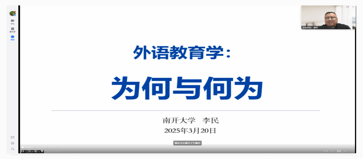 On March 20, at the invitation of SFL, Professor Li Min from the School of Foreign Studies at Nankai University delivered an enlightening academic lecture titled "Foreign Language Education: Why and How" for the faculty of the School of Foreign Studies. Over 70 faculty members and students from the School attended the lecture online. The event was presided over by Vice Dean Li Jiajun.
