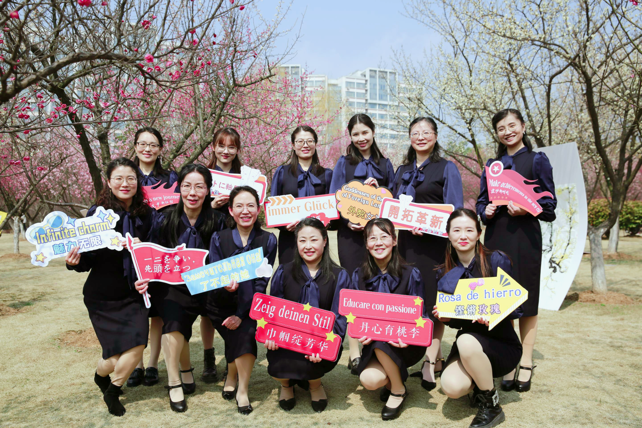 3月8日,伟德国际194612位女教师参加了学校在梅园举办的“美丽邂逅,梦想绽放”庆祝“三八”国际妇女节活动暨首届梅樱节开幕式。开幕式上,知性优雅的伟德国际1946教师手举彰显外院特色的标牌,尽情展现了外院女教师风采。、