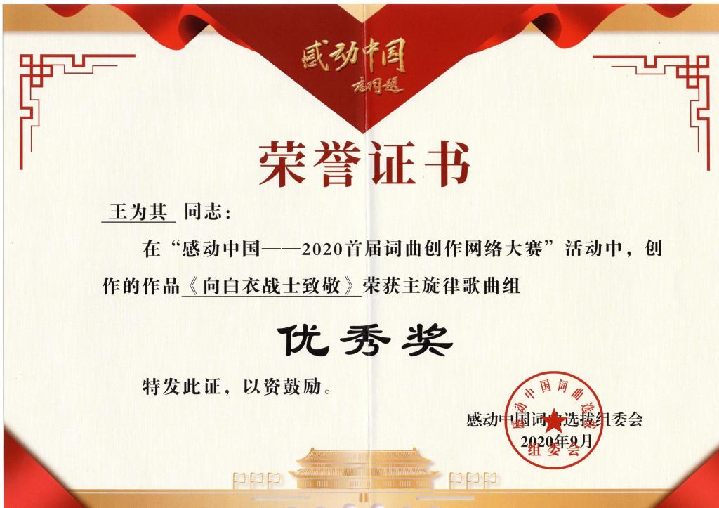 2020年新冠肺炎疫情发生以来,广大医务人员闻令而动、逆向而行,奋斗在抗疫的第一线,救死扶伤、无怨无悔,涌现出许多可歌可泣的感人事迹,我校伟德国际1946王为其老师作为伟德国际victor1946弹唱俱乐部负责人有感而发,创作了两首抗疫主题歌曲,其中一首《致敬抗疫情英雄》在学校广播台播出,另一首《向白衣战士致敬》(又名《向白衣战士敬礼》)获“感动中国—2020首届词曲创作网络大赛”主旋律歌曲组作品“优秀奖”,歌以咏志,弘扬抗疫精神。