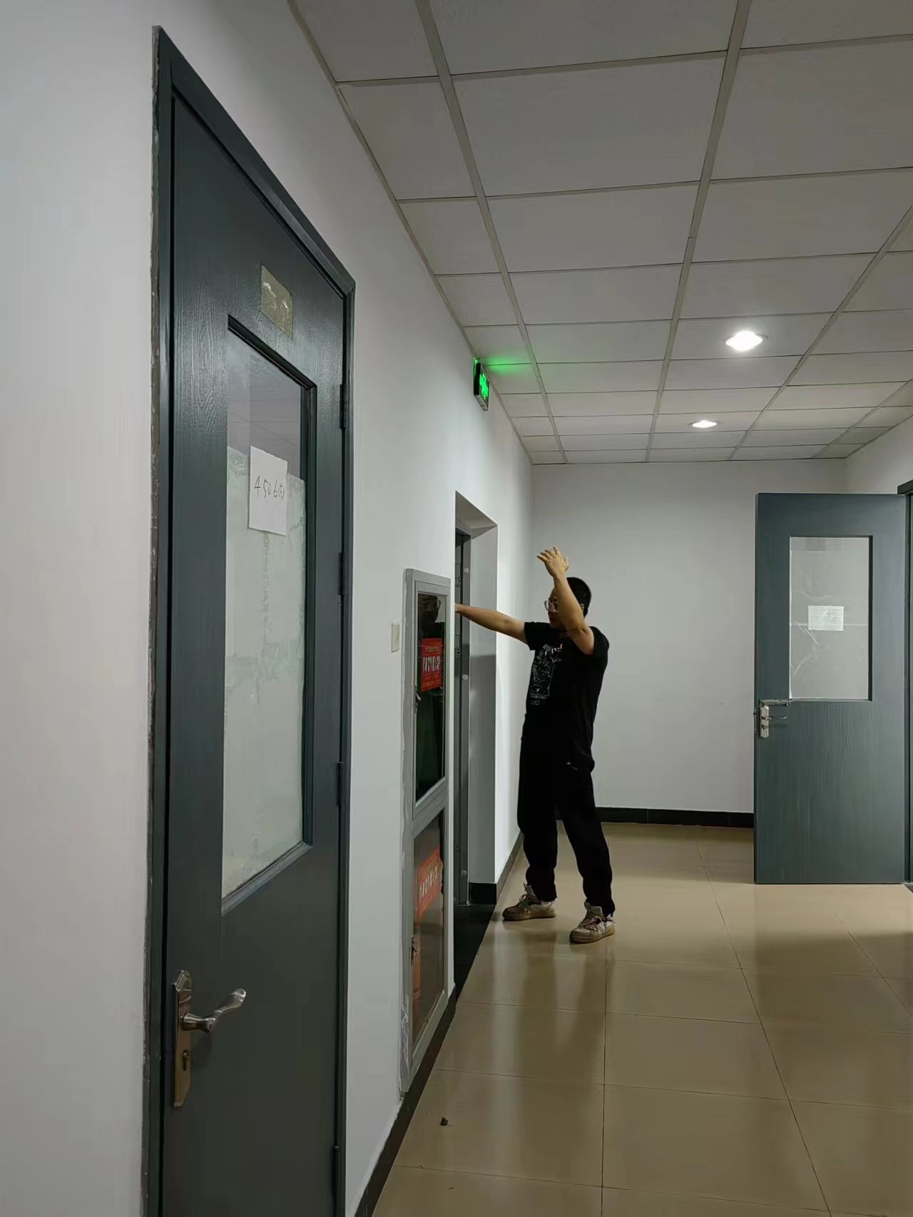 4、实验室主任李萌在东侧楼梯口组织大家有序撤离。